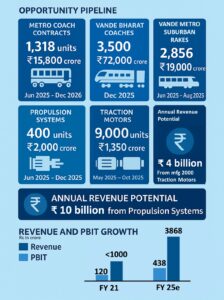 TRS sees a robust opportunity pipeline across multiple high-value rail infrastructure segments. The company is eyeing significant opportunities in metro coach contracts, with around 1318 units valued at approximately Rs 15,800 crore expected to be tendered between June 2025 and December 2026. A major growth area is the Vande Bharat coach segment (including both aluminium and stainless steel variants), with an estimated 3500 units valued at Rs 72,000 crore slated for tendering in December 2025.